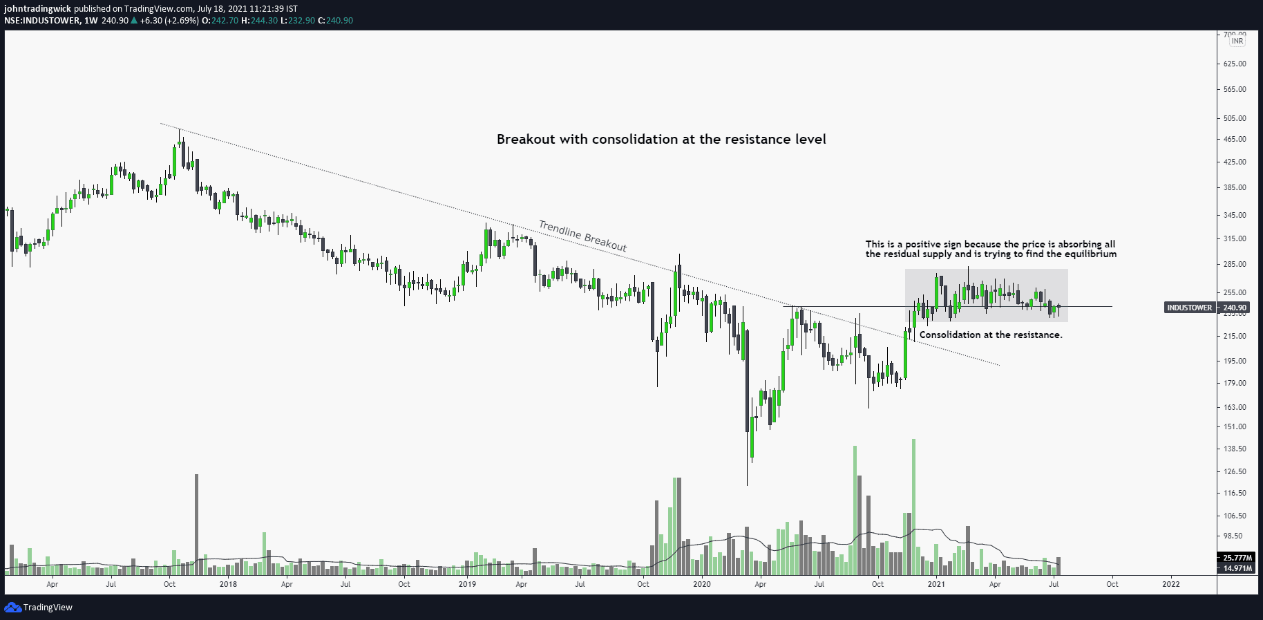 Sometimes, the price may start consolidating at the resistance level. This is a positive sign because the price is absorbing all the residual supply and is trying to find the equilibrium.